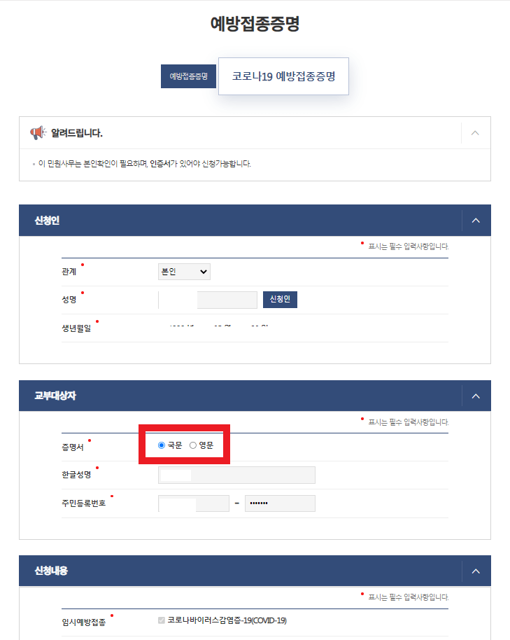 교부대상자 증명서에 '국문/영문' 중에서 선택하여 발급하면 됩니다. 그리고 아래에 예방접종에 체크되어 있는지 확인하고, '민원신청하기'를 클릭합니다. 그러면 바로 발급화면이 뜨는데, 문서출력이 가능합니다.