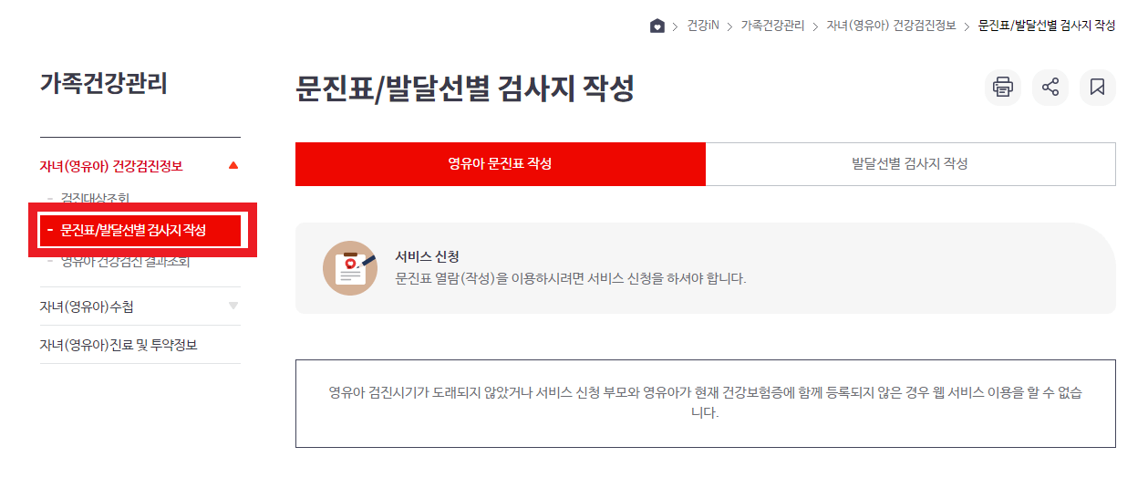 또한, 온라인 서비스가 어려운 경우, 검진기관에서 제공하는 '서면 문진표' 또는 '발달선별검사지'를 작성하여 영유아 건강검진을 받으시면 됩니다.