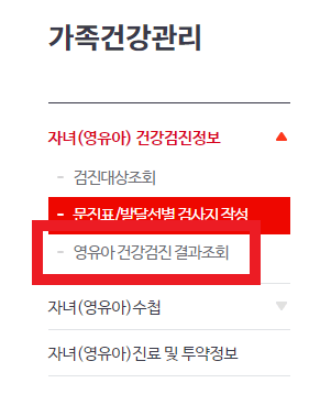 건강 in > 가족건강관리 > 자녀(영유아) 건강검진정보 > 영유아 건강검진 결과조회